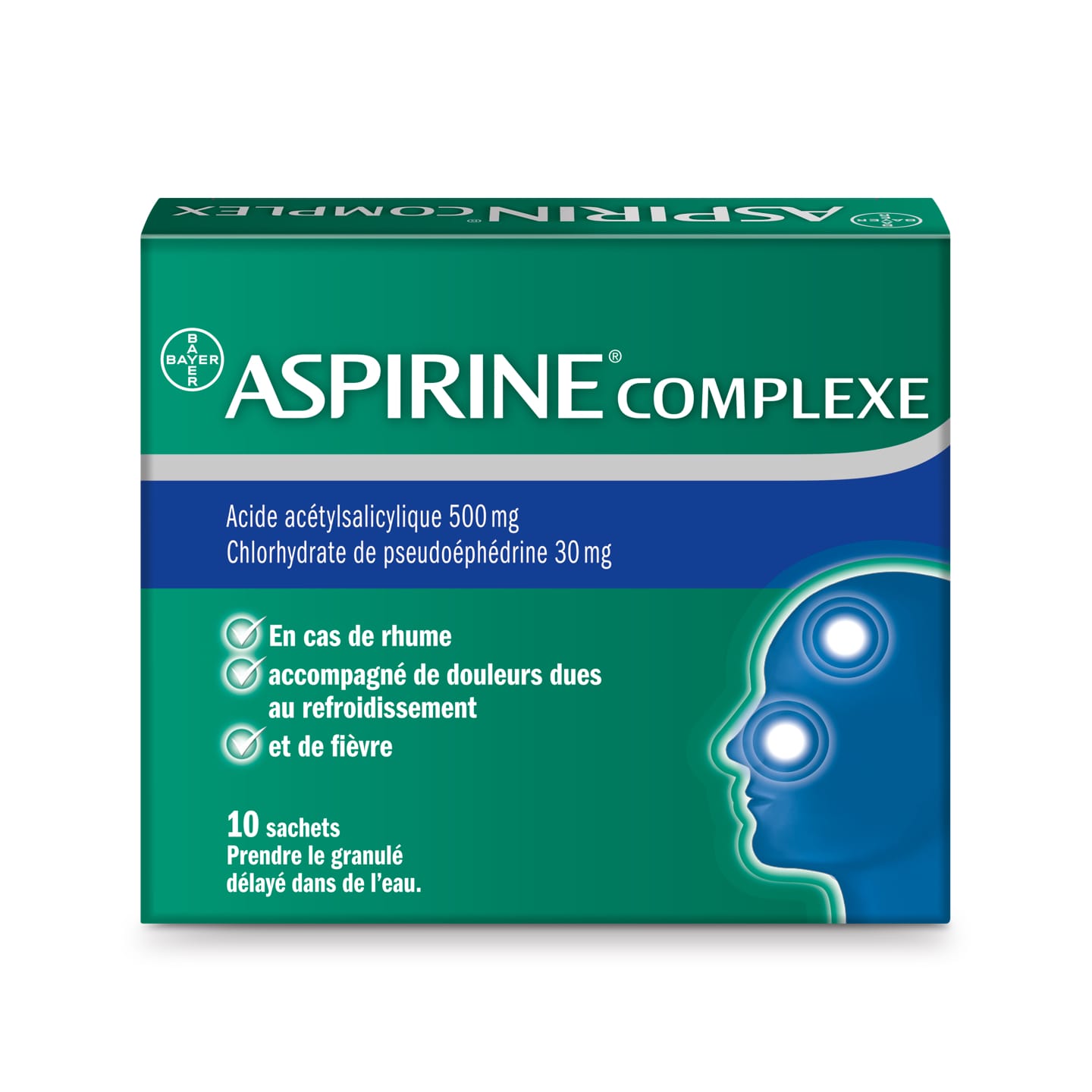 Aspirine® Complexe soulage les symptômes des refroidissements et de la grippe en associant les propriétés antalgiques, anti-inflammatoires et antipyrétiques de l’acide acétylsalicylique à la pseudoéphédrine, principe actif qui décongestionne la muqueuse nasale. Aspirine® Complexe se dissout dans de l’eau pour soulager les symptômes des refroidissements et de la grippe tels que rhume, douleurs et fièvre.